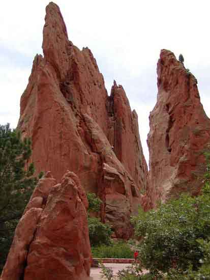 Garden Of the Gods (GOTG) is one of the more dramatic geologic areas in Colorado. GOTG features a clear view of Pikes Peak as it is less than 30 miles from the mountain. Set near Colorado Springs, it features a good set of hiking trails throughout the park. Unlike Pikes Peak, virtually anyone should be able to explore the park without too much exertion if you're not used to the altitude.You can find out more about this site at the Garden Of the Gods Web site.