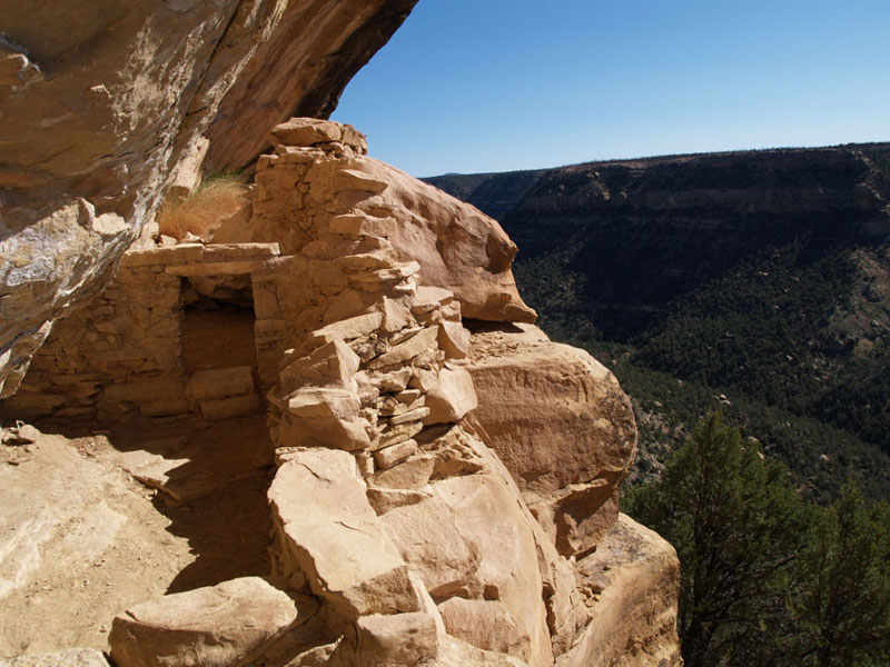 Mesa Verde National Park is located in southwest Colorado near the town of Cortez. It is one of the largest Anasazi ruins sites in the United States. It is truly an amazing sight and it's amazing people lived in the cliff faces as they did.My first ruin when I visited Mesa Verde on Memorial Day weekend of 2004 was Balcony House. I shot this photo looking back towards an unopened section and was struck by how dramatic it is - seeing a man made structure so close to cliff.