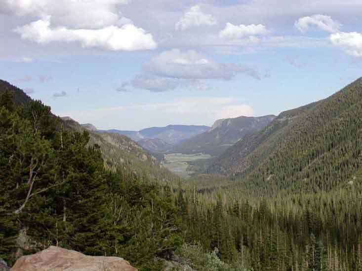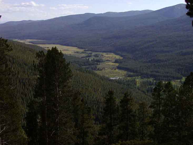 This is one of the mountain vallies that line RMNP. I have always liked this one because of the nice contrast between the deep green of the trees and the lighter green of the marsh grasses below them. The trees go on for miles forming a green carpet over the lower mountain peaks.