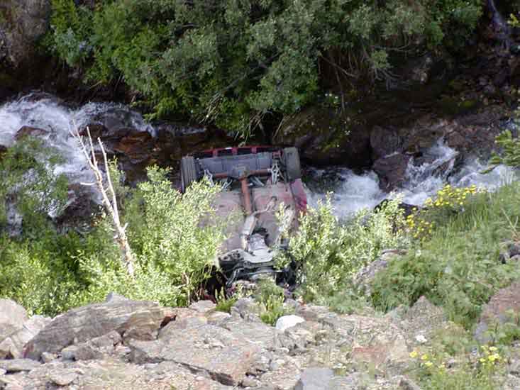 They apparently thought they had it in park or something when they got out of it to look around. Unfortunately for them, it wasn't and rolled down a very steep drop - the cliff face is at close to a 60 degree angle and goes down for what must be over 100 feet. After it rolled down and hit the bottom it flipped over onto her roof in the same creek that forms Chasm Falls. A park ranger was already on scene when I got there handling the situation. I'm sure they got it out - the only question is if a wrecker could do it or if they needed a helicopter to pull it out. Either way I bet it was expensive!
