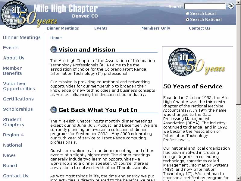 I was approached at an ICC meeting by one of the board members to re-design the Denver AITP Web Site. I had previously taught a JavaScript course for them so they had known that I do web design and development.The original site looked like this.