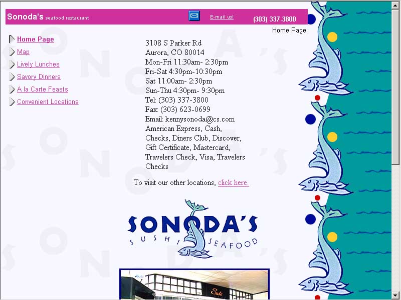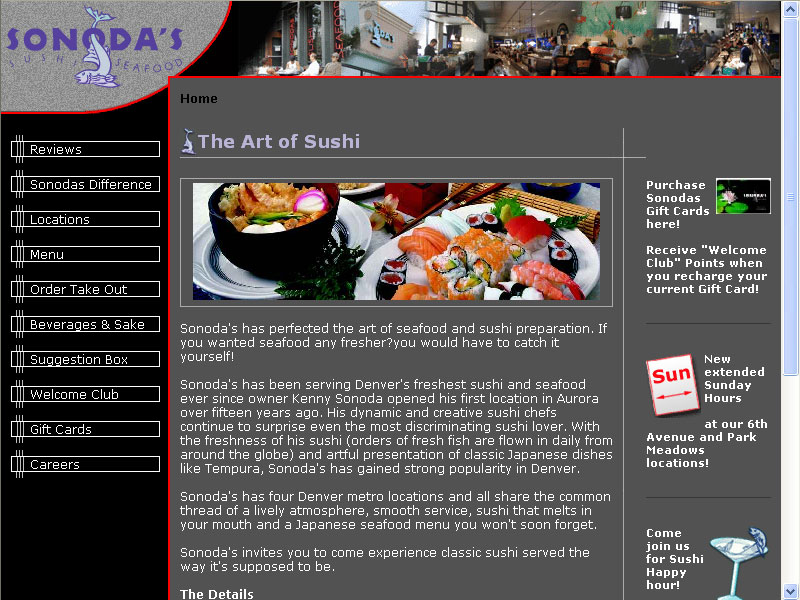 I was contracted to design and produce the Sonoda's Sushi web site through IT Portfolio. Sonoda's had a previous web site on CitySearch but the site was fairly basic and didn't offer any leads gathering capability. It can be seen here.This design stayed well within the look and feel of the previously established media and the physical restaurants themselves. All the food pictures that appear on a white background were taken on my digicam and cleaned up in Adobe Photoshop. I also took all the restaurant pictures that appear on this site, including those in the header. The first iteration of this site was only a 25 hour job and was delivered on budget and on time.