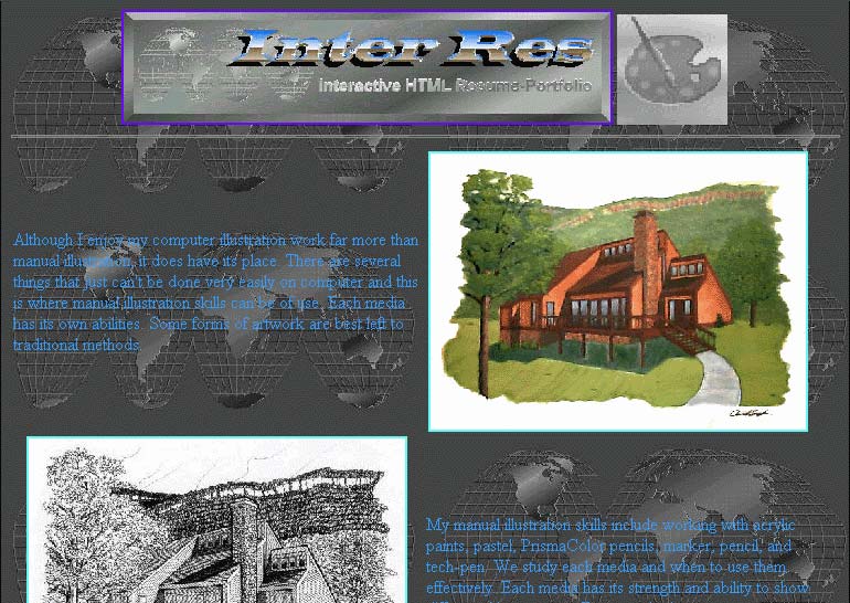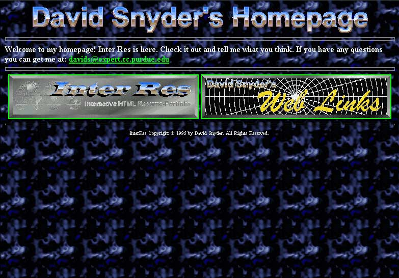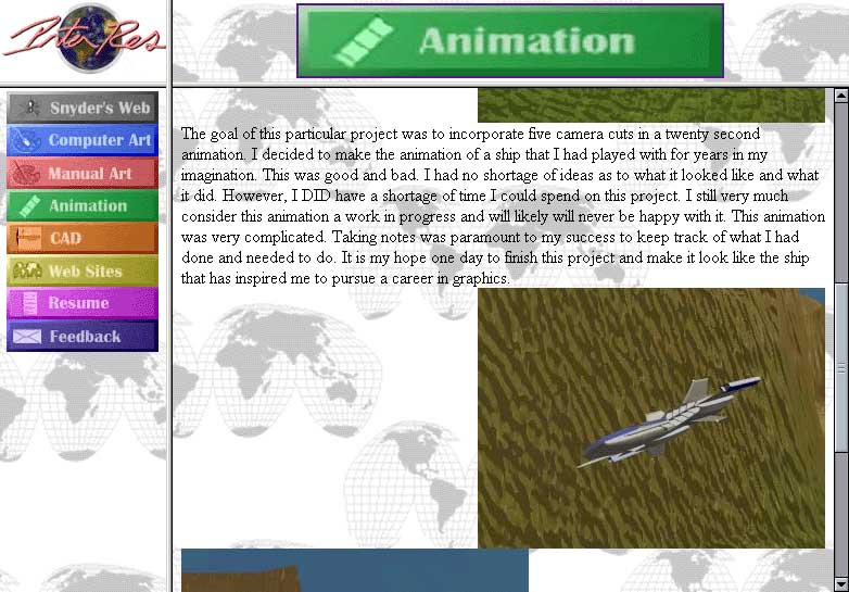 My second online résumé created at the same time as the 1996 version of the Snyder's Web. This site was to showcase my work I had done during college. It improved on the first Inter-Res in a number of areas, mainly in terms of organization and readability.This site used a system exactly like the sister site (the Snyder's Web - 1996). Once again it had no JavaScripts.