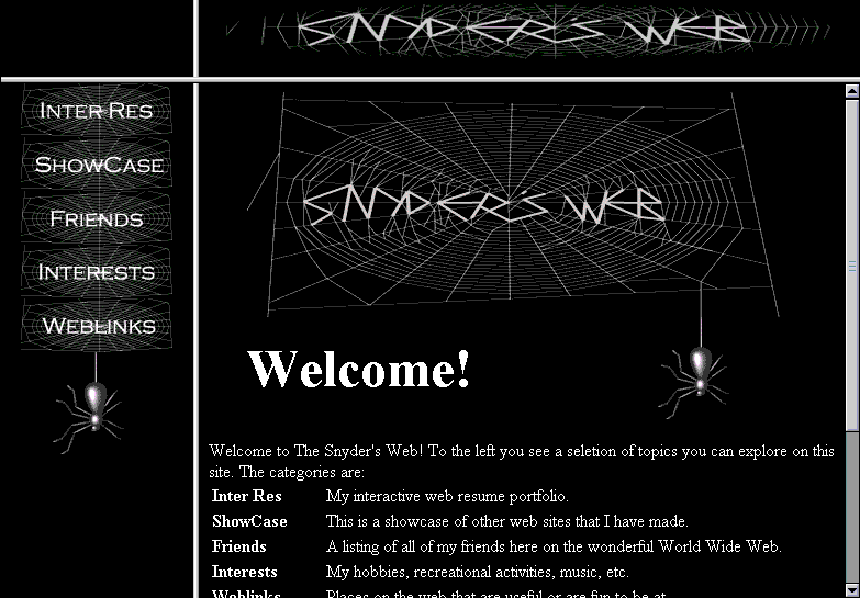 I was fresh out of college when I wrote this. It was a post-graduation project. At the time I made this, I didn't know much JavaScript, so the framed version of this web site used a series of nested frames to change more than one frame panel at a time. It worked, but was difficult to maintain and had a tendency to crash Netscape 2.0. This site featured a non-framed version for legacy browsers.This web site was a pretty simple one overall. The most time consuming parts were making/rending the spider in 3D Studio R3 and creating the Snyder's Web logo artwork. I actually borrowed a few library books so I could get the general look of the web right. This site also is the first time I attempted any kind of elaborate table/text layout.