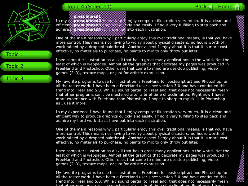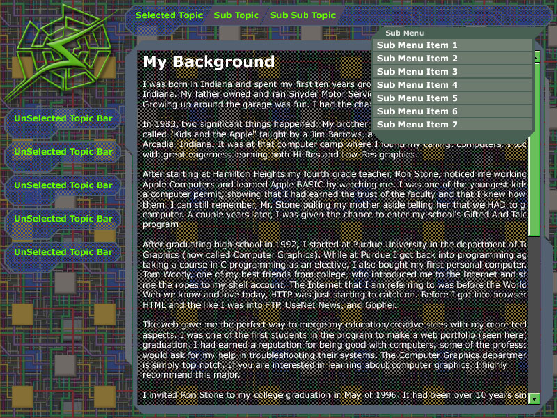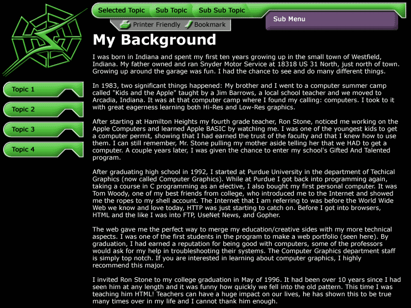 Looking to build on the 2001 version of my web site, I started brainstorming shortly after it launched. The 2001 version of the site worked well enough, but functionality wise it was lacking in a few areas. The biggest was it could only take two levels of content: Topic > Sub-Topic. That and browser bugs started showing up. Mozilla had the biggest/most annoying Bug #138120 that caused elements to be incorrectly unhidden. Internet Explorer 6.0 had a bug that caused the sub menu background not to properly render.The look of this site is much like the 2001 Snyder's Web site but is a little more polished. The color saturation was decreased on the topic bars and logo. The topic bars also had their look tweaked a little bit, and the sub menus got a nice little bevel effect. The cut-out in the topic bar also exposes more of the sub menu and makes it stand out a little more. Since the sub menu now changes based on what sub topic is selected, I created a little feature that expands and blinks it to show the user that it had changed. Printing and bookmarking buttons were moved under the topic bar this time. As far as the interface, the biggest change was the addition of the sub topic system. This allowed content to be deeply nested. I can have Topic > Sub Topic > Sub Topic... ad nauseum. Implementing this meant that the internal architecture of the site had to be overhauled.